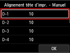 L'écran de saisie permettant d'entrer les valeurs d'ajustement de la position de la tête d'impression s'affiche.