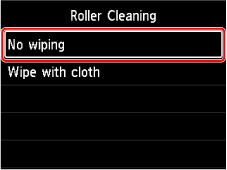 Selectaţi Ştergere cu cârpa (Wipe with cloth) pe ecranul Curăţare rolă (Roller Cleaning).