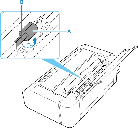 Ştergeţi rola de alimentare cu hârtie (A) din alimentatorul superior cu o lavetă umedă sau alte materiale. Nu atingeţi cu degetele rola de alimentare cu hârtie, ştergeţi-o în timp ce rotiţi axul (B) cu degetele.