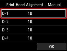 Reglarea Manuală (Manual) necesită examinarea modelului de testare imprimat şi introducerea unei valori de reglare.