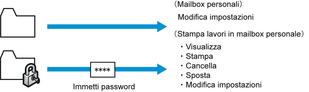 Per la massima sicurezza è possibile specificare una password per le caselle personali. Dopo aver impostato una password, la stessa sarà richiesta per modificare le impostazioni della casella personale, nonché per visualizzare, stampare, eliminare, spostare e modificare i lavori salvati nella casella personale.