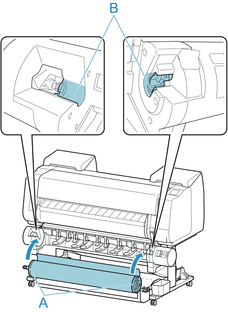 Hold flanges (A) so that roll holder's white gear is on left, align roll holder shaft with roll holder slot left and right guide grooves (B), and load.