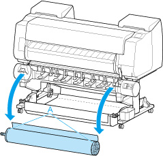 Segure o suporte do rolo por suas flanges (A) e remova do slot do suporte em rolo.