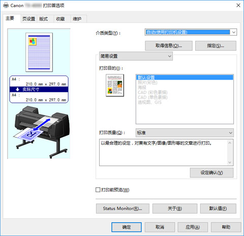 2. 在打印机驱动程序上完成纸张类型等详细设置。