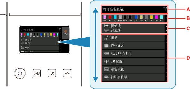 可以从主页屏幕查看打印机状态并选择维护、纸张操作、设置和其他菜单。