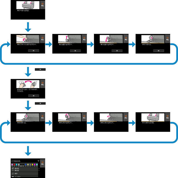 完成说明中的某项操作后,打印机会检测到该项操作并切换至下一说明屏幕。