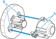 Allineare le linguette dell'attacco per rotolo da 3" (A) ai fori sul supporto per rotolo o blocco supporto (B) e inserirle a fondo.