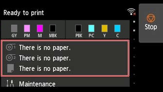 용지 공급 전에 인쇄 작업이 이미 수신된 경우에는 인쇄 작업에서 지정한 용지 종류와 크기가 터치 스크린에 표시됩니다.