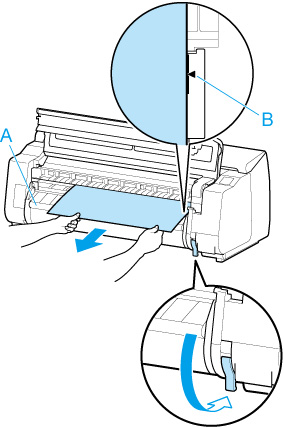 Segure no meio da borda inicial do papel em rolo e puxe-a de forma suave e uniforme até atingir a posição da guia de saída (A). Neste momento, alinhe a borda direita do papel em rolo paralela à linha de alinhamento do papel (B). Quando o papel estiver paralelo à linha, abaixe a alavanca de liberação.