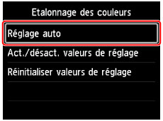 - Pour activer ou désactiver les valeurs de réglage de l'étalonnage des couleurs, sélectionnez Act./désact. valeurs de réglage dans l'écran Etalonnage des couleurs.