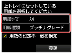 上トレイにセットした用紙に合わせて[用紙サイズ]と[用紙種類]を設定し、[登録]を選んでOKボタンを押す