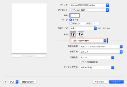 ポップアップメニューから[品位と用紙の種類]を選ぶ