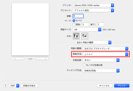 [給紙方法]で上トレイを選びます。