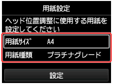 使用する用紙に合わせて[用紙サイズ]と[用紙種類]を設定し、[設定]を選んでOKボタンを押します。