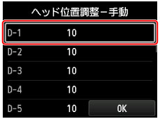プリントヘッド位置調整パターンを見て、各列の中から線がまっすぐなパターンの番号を選ぶ