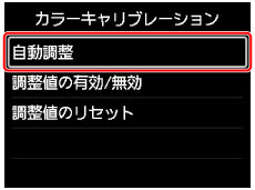 - [カラーキャリブレーション]画面で[調整値の有効/無効]を選ぶと、カラーキャリブレーションの調整値を有効または無効に設定することができます。