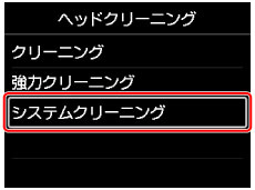 プリントヘッドの強力クリーニングを行っても効果がない場合は、システムクリーニングを行ってください。システムクリーニングは、非常に多くのインクを消耗します。頻繁に行うと、インクが早く消費されます。必要な場合のみ行ってください。