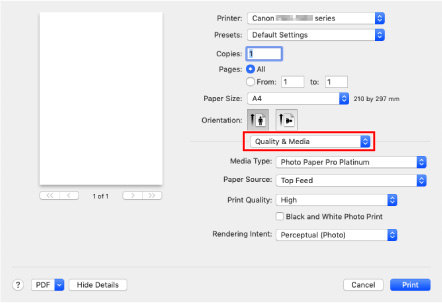 Во всплывающем меню выберите Качество и носители (Quality & Media).