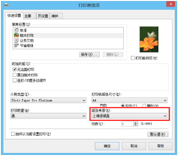 在纸张来源中选择已装入纸张的上端进纸盘。
