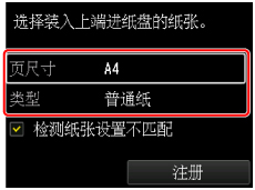 装入纸张后,会显示上端进纸盘的纸张信息注册屏幕。 页尺寸选择为A4Letter,并将类型选择为普通纸,选择注册,然后按OK按钮。