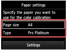 Specify Page size and Type for the paper to be used, select Settings, then press the OK button.