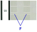 • Because CO ink is colorless, its pattern is printed over the MBK ink pattern. Check for horizontal streaks (F) in the dark gray bands of the pattern.
