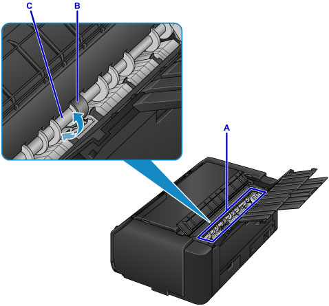 If the problem is not resolved after cleaning the paper feed roller, turn off the power, unplug the power cord, then wipe the paper feed roller parts (the large paper feed roller in the center and four rollers on each side of it) (A) located in the top feed with a moistened cotton swab or the like. Do not touch the paper feed roller (B) with your fingers. Wipe the paper feed roller parts with a cotton swab while turning the shaft (C) with your fingers.