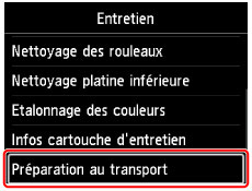 Sélectionnez Préparation au transport, puis appuyez sur le bouton OK.