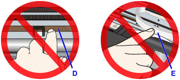 • Do not touch clear film (D) or white belt (E). If you soil or scratch these parts by touching them with paper or your hand, it could damage the printer.