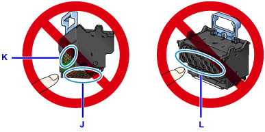 • Always hold the print head by the handle. Never touch the nozzles (J) or metal contacts (K). This may damage the print head and affect printing quality.