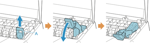 Ziehen Sie das Griffteil (A) der Sperrhebel für die Tintenpatrone der jeweiligen Farbe nach vorne, um den Behälter auszutauschen, während Sie auf die Komponente B drücken.