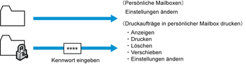 Aus Sicherheitsgründen können Kennwörter für die Personal Boxes eingestellt werden. Nach dem Einstellen eines Kennworts muss dieses bei einer Änderung der Einstellungen der Personal Box sowie beim Anzeigen, Drucken, Löschen, Verschieben und Ändern von in der Personal Box gespeicherten Druckaufträgen angegeben werden.