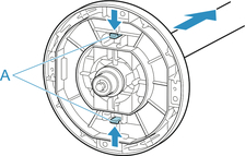 Para retirar la Sujeción de tubo de papel de tres pulgadas, presione las pestañas (A) hacia dentro y retire el accesorio.