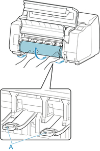 Afferrare le flange (A) in modo che l'ingranaggio bianco del supporto per rotolo si trovi a sinistra, allineare l'albero del supporto per rotolo con le scanalature di guida destra e sinistra dello slot supporto rotolo (B) ed eseguire il caricamento.