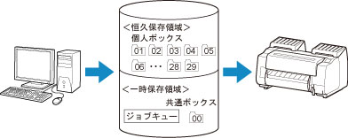 プリンターのハードディスクの保存領域は、一時保存領域と恒久保存領域に分かれています。一時保存領域にはジョブキューを保存する領域と共通ボックスがあり、恒久保存領域には個人ボックスがあります。