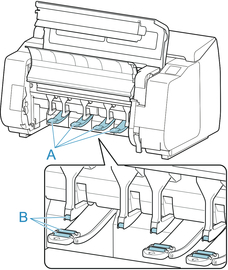 Откройте верхняя крышка и направляющая для выхода и протрите части, соприкасающиеся с бумагой (A, B).