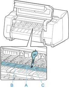 If paper dust has accumulated in vacuum holes (A) on platen or in borderless printing ink grooves (B), use cleaning brush (C), provided with printer, to wipe it away.