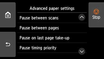 이 설정은 프린터의 터치 스크린에서 지정할 수도 있습니다. 용지 설정(Paper settings)에서 용지 설정(Paper settings) > 고급(Advanced)을 선택하고 스캔 사이 일시 중지(Pause between scans) 및 페이지 사이 일시 중지(Pause between pages)를 설정합니다.