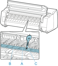 • Berühren Sie niemals die Lineare Skala (A), die Schlittenschiene (B) oder den Tintenrohr-Stabilisator (C). Dadurch können diese Komponenten beschädigt werden.