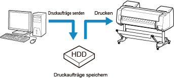 Geben Sie zum Speichern von Druckaufträgen, die aus anderer Software oder anderen Systemen als dem Druckertreiber oder Anwendungen des Druckers gesendet werden, die Ausgabemethode an, und wählen Sie über das Bedienfeld die Einstellung aus, mit der der Druck nach dem Speichern der Druckdaten ausgeführt wird.