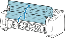 En función del papel, es posible que el rollo de papel se rasgue al introducirlo y que no se alimente correctamente. En este caso, deberá cargar el papel manualmente tras establecer Ajuste de retención de papel en Liberar en la pantalla táctil. Levante la palanca de liberación, introduzca el rollo de papel hasta que sobresalga el borde inicial por la placa, baje la palanca de liberación y, a continuación, lleve a cabo el siguiente paso. Sin embargo, si se ha configurado Ajuste de retención de papel en Liberar, el cambio automático de los rollos superior e inferior no es posible.