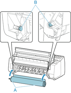 Veillez à ne pas vous coincer les doigts entre l'arbre du Support du rouleau et les guides (B) lors du chargement du rouleau.