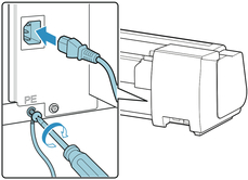 プリンター背面のアース端子に市販のドライバーを使ってアース線を取り付け、プリンター背面の電源コード接続部に電源コードを差し込みます。