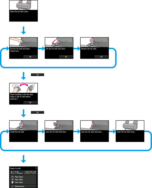 가이던스에 표시된 조작을 실행하면 프린터가 이것을 인식하여 다음 가이던스 화면으로 전환합니다.