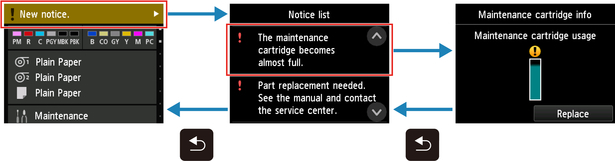 잉크가 부족하거나 기타 알림이 있는 경우 프린터 정보 표시 영역에 새 알림이 있습니다.(New notice.)가 나타납니다. 이를 누르면 알림 목록(Notice list) 화면이 표시되며 최신 메시지부터 순서대로 확인할 수 있습니다. 메시지를 누르면 메시지 세부 정보 화면이 표시되며 세부 정보를 확인하고 조치를 취할 수 있습니다.