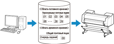 - Задания, для которых вы выбрали Печать (Print) в меню Способ вывода (Output Method), сохраняются в общий почтовый ящик и классифицируются как сохраненные задания.
