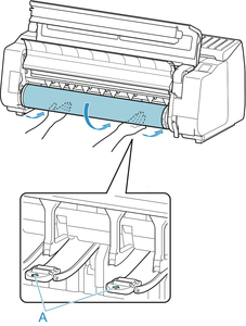 6. Ziehen Sie das Rollenpapier gleichmäßig heraus, führen Sie die Vorderkante zwischen Rollenpapier und den Pfeilen (A) direkt darunter ein und schieben Sie das Rollenpapier vor, bis Sie einen Ton hören.