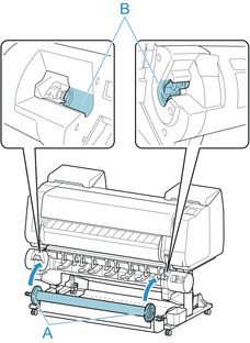 Richten Sie die Laschen (A) der 3-Zoll-Papierspulenaufhängung mit den Bohrungen am Rollenhalter oder Halteranschlag (B) aus und setzen Sie sie fest ein.