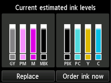 If the touch screen indicates to replace the ink tank, replace the ink tank. If a message is displayed indicating to check the remaining ink levels, or after tasks that consume a lot of ink such as large-format printing or head cleaning, check the remaining levels and replace ink tank as needed.