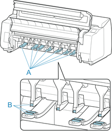 Open top cover and output guide and clean parts that come in contact with paper (A, B).
